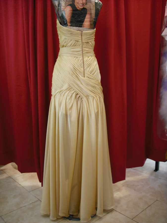 Vestido largo dorado entallado hasta caderas drapeado, busto escote corazón con recorte y falda con tajo.